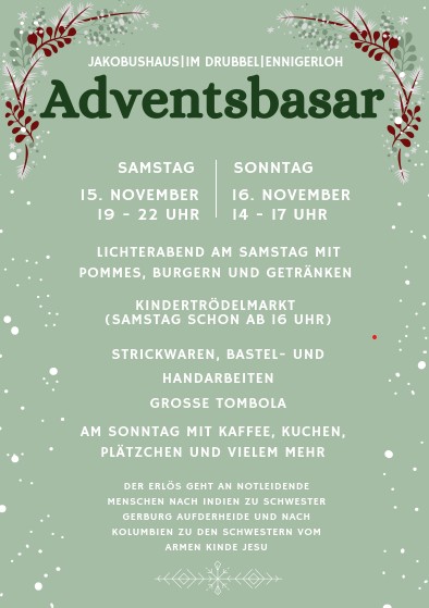 Lichterabend und Basar am/im Jakobushaus Herzlich laden wir am Samstag, 15.11. um 18 Uhr zu einem Familiengottesdienst in die St. Jakobus Kirche ein. Im Anschluss an den Familiengottesdienst sind alle herzlich zum diesjährigen Auftaktabend des Basars eingeladen. Vor dem Jakobushaus findet ein Lichtermarkt statt, der Gelegenheit bietet zum gemütlichen Verweilen, gemeinsamen Essen und Trinken und …