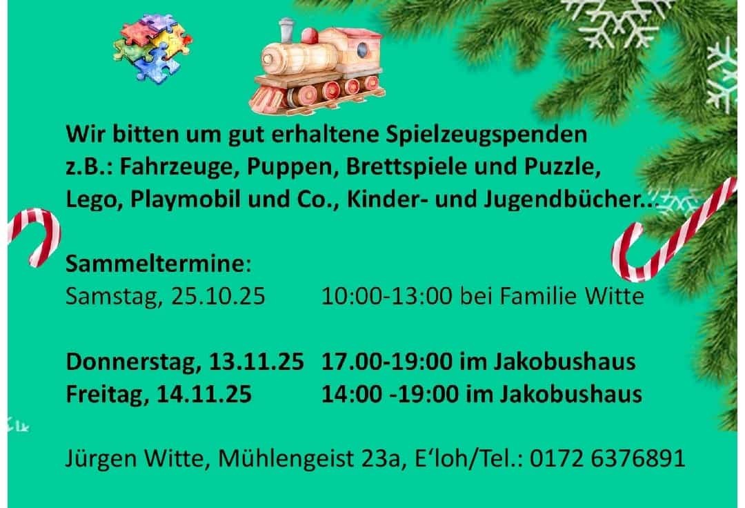 Wir bitten um gut erhaltene Spielzeugspenden z. B.: Fahrzeuge, Puppen, Brettspiele und Puzzle, Lego, Playmobil und Co., Kinder- und Jugendbücher….