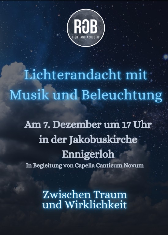 Wir laden herzlich ein zur Lichterandacht “Zwischen Traum und Wirklichkeit” mit Musik und Beleuchtung am 07.12. um 17 Uhr in der Jakobuskirche. In Begleitung von Capella Canticum Novum.