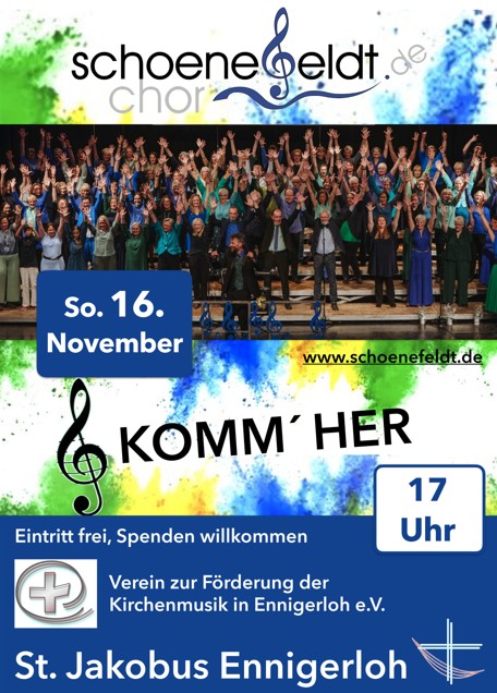 Der Förderverein für Kirchenmusik lädt zu einem Konzert am 16.11. um 17.00 Uhr mit dem Schoenefeldt Chor in die Jakobuskirche in Ennigerloh ein. Der Chor wird sein Programm unter dem Titel „Komm´her“ gestalten. Das Konzert steht im Zeichen der Begegnung und Nähe – musikalisch wie menschlich. Mit bekannten Popsongs, Balladen und modernen Chorsätzen lädt der …