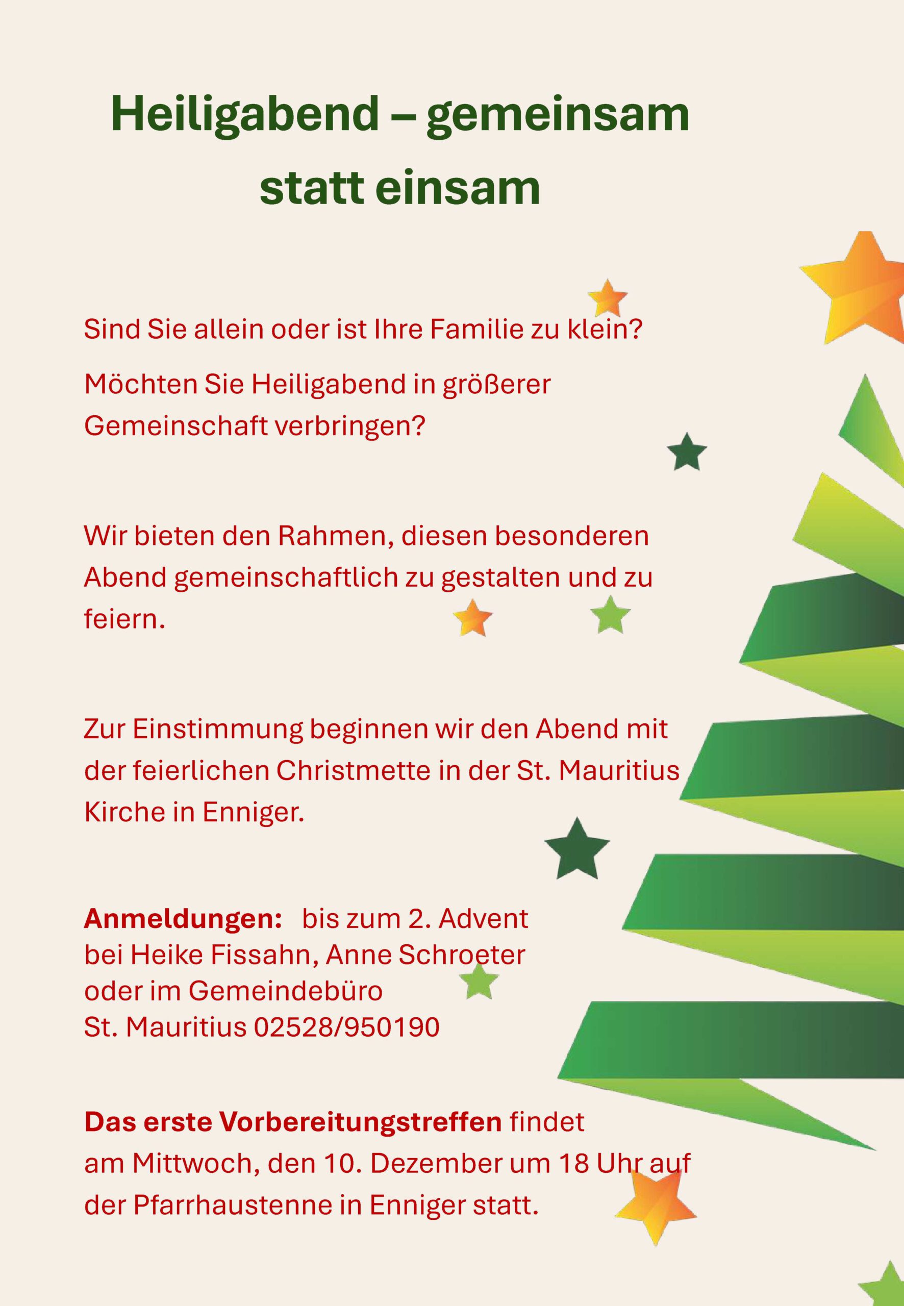 Sind Sie allein oder Ihre Familie zu klein? Möchten Sie Heiligabend in größerer Gemeinschaft verbringen? Wir bieten den Rahmen, diesen besonderen Abend gemeinschaftlich zu gestalten und zu feiern. Zur Einstimmung beginnen wir den Abend mit der feierlichen Christmette in der St. Mauritius Kirche in Enniger. Anmeldungen: bis zum 2. Advent bei Heike Fissahn, Anne Schroeter …
