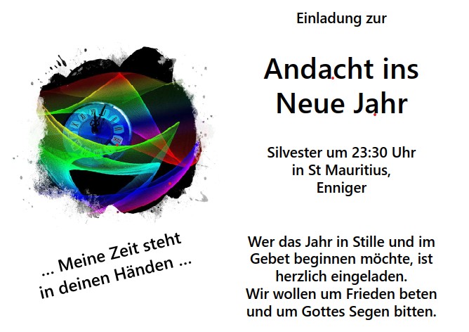 Wer das Jahr in Stille und im Gebet beginnen möchte, ist herzlich an Silvester um 23.30 Uhr in die St. Mauritius Kirche eingeladen. Wir wollen um Frieden und um Gottes Segen bitten.