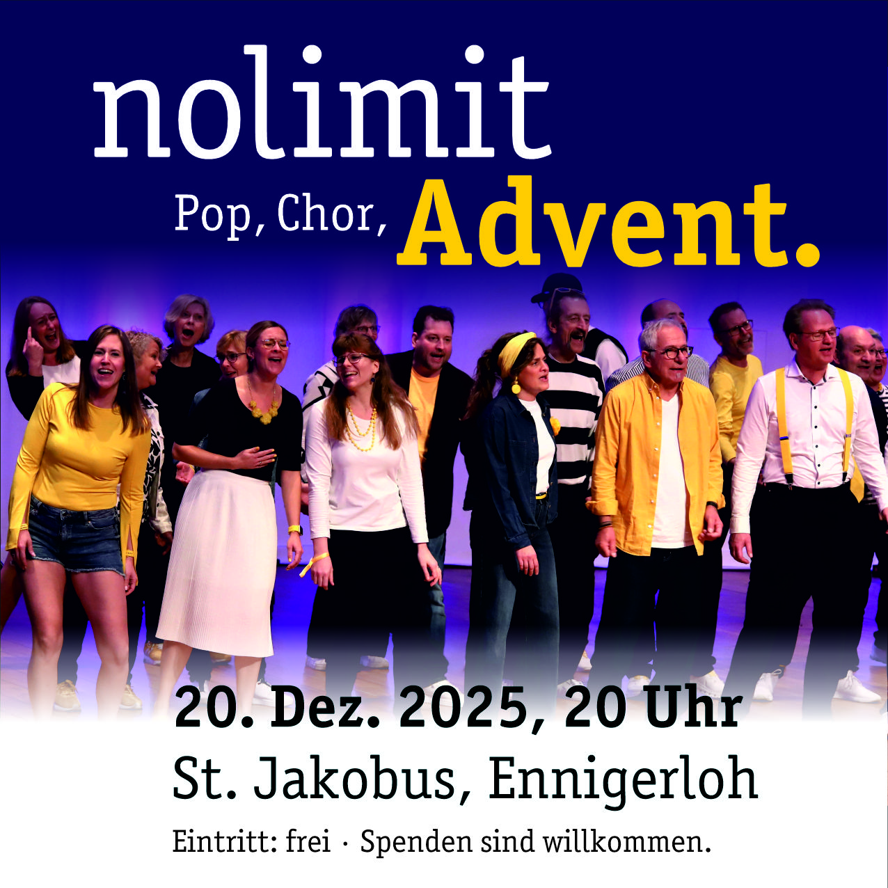 Wir laden herzlich ein zum Adventskonzert vom Popchor nolimit am Samstag, 20.12.2025, um 20 Uhr in der Jakobuskirche. Der Eintritt ist frei. Spenden sind willkommen.