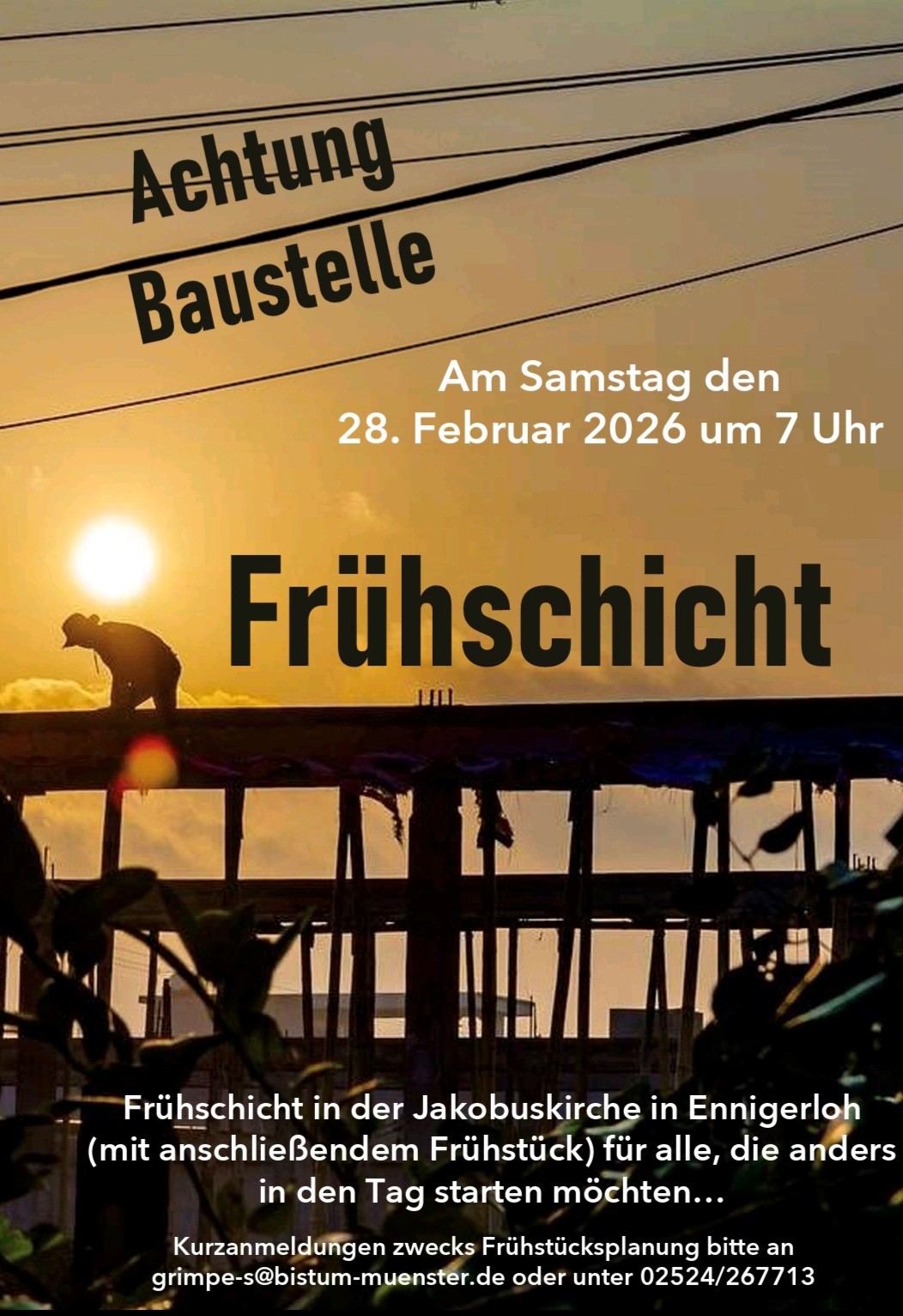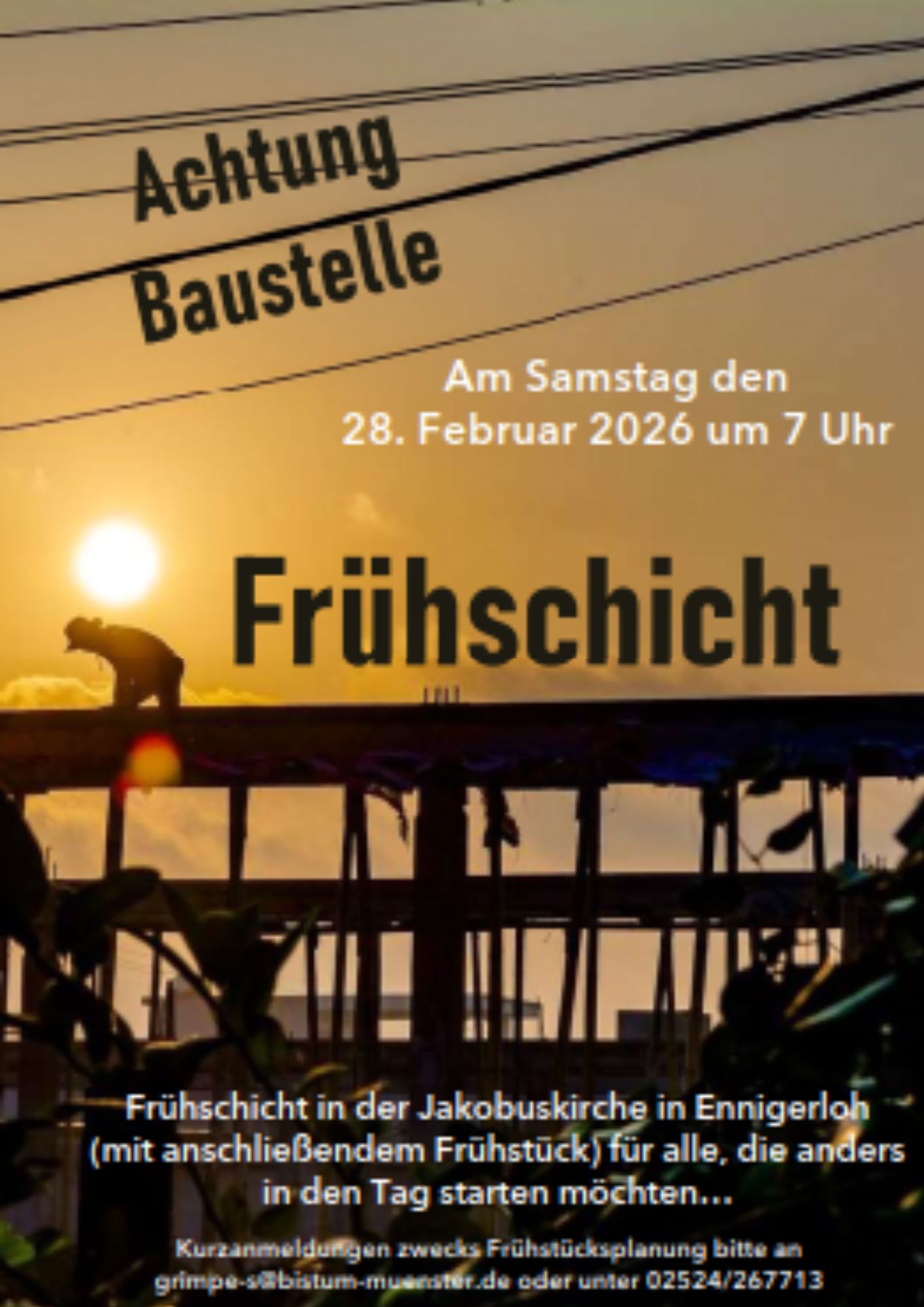 Für alle, die anders in den Tag starten möchten, findet am Samstag, 28.02. um 7 Uhr eine Frühschicht in der Jakobuskirche statt. Anschließend wird gemeinsam im Jakobushaus gefrühstückt. Zwecks Frühstücksplanung bitten wir um Anmeldung unter grimpe-s@bistum-muenster.de oder unter 02524-267713.