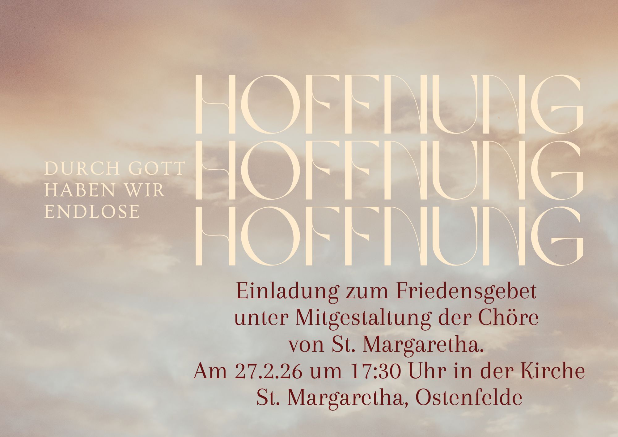 Zum Friedensgebet unter Mitgestaltung der Chöre von St. Margaretha, laden wir am 27.2.26 um 17:30 Uhr in die Kirche St. Margaretha in Ostenfelde ein.