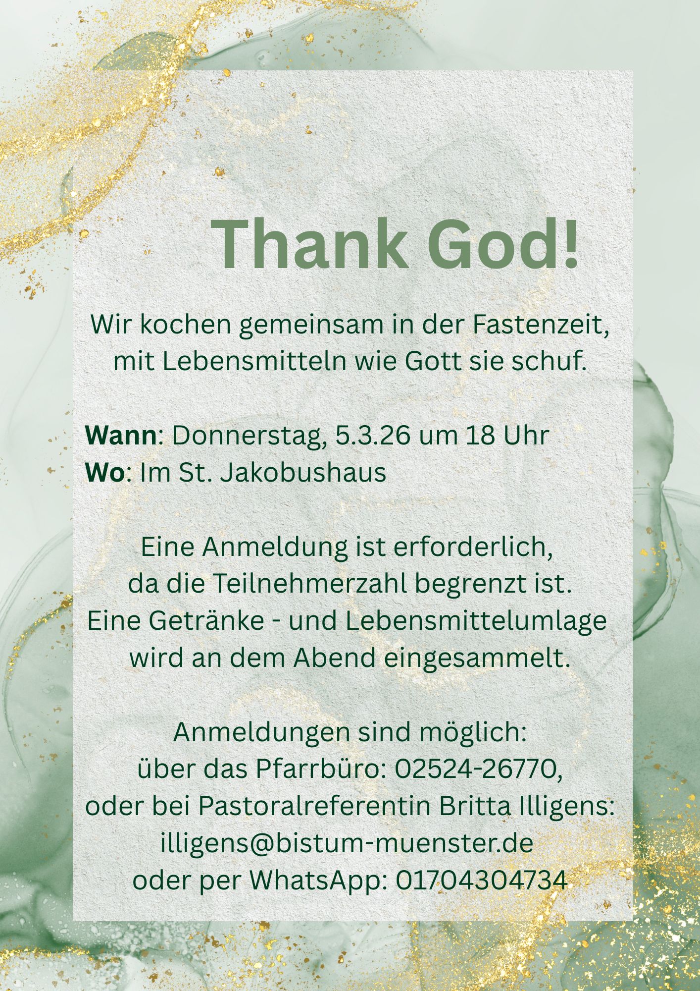 Wir kochen gemeinsam in der Fastenzeit, mit Lebensmitteln wie Gott sie schuf. Wann: Donnerstag, 05.03.2026 um 18 Uhr Wo: Im Jakobushaus Eine Anmeldung ist erforderlich, da die Teilnehmerzahl begrenzt ist. Eine Getränke- und Lebensmittelumlage wird an dem Abend eingesammelt. Anmeldungen sind über das Pfarrbüro St. Jakobus oder bei Britta Illigens.