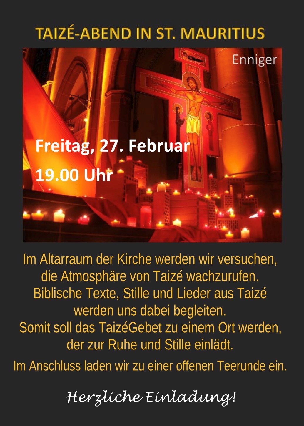 Nur kurz mal INNEHALTEN: am Mittwoch, den 4.3.26 um 18:30 Uhr laden wir zu einer Feierabend-Meditation in der Fastenzeit in die St. Jakobuskirche ein. Etwa eine halbe Stunde lang lassen wir den Alltag außen vor und genießen bei Musik, kurzen Texten und Stille, die erholsame Pause. Herzliche Einladung an alle Interessierten! Vielen Dank!