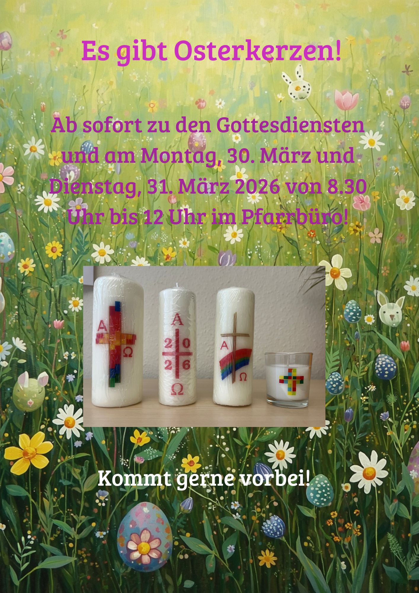 🕯️✨ Osterzeit steht vor der Tür ✨🕯️ Es gibt wieder wunderschöne Osterkerzen! 🌷🐣Hol dir dein Licht für die Feiertage und bring Wärme & Hoffnung in dein Zuhause 💛 📍 Erhältlich bei den Gottesdiensten📅 Zusätzlich am 30. & 31. März⏰ 8:30 – 12:00 Uhr im Pfarrbüro Kommt gerne vorbei!