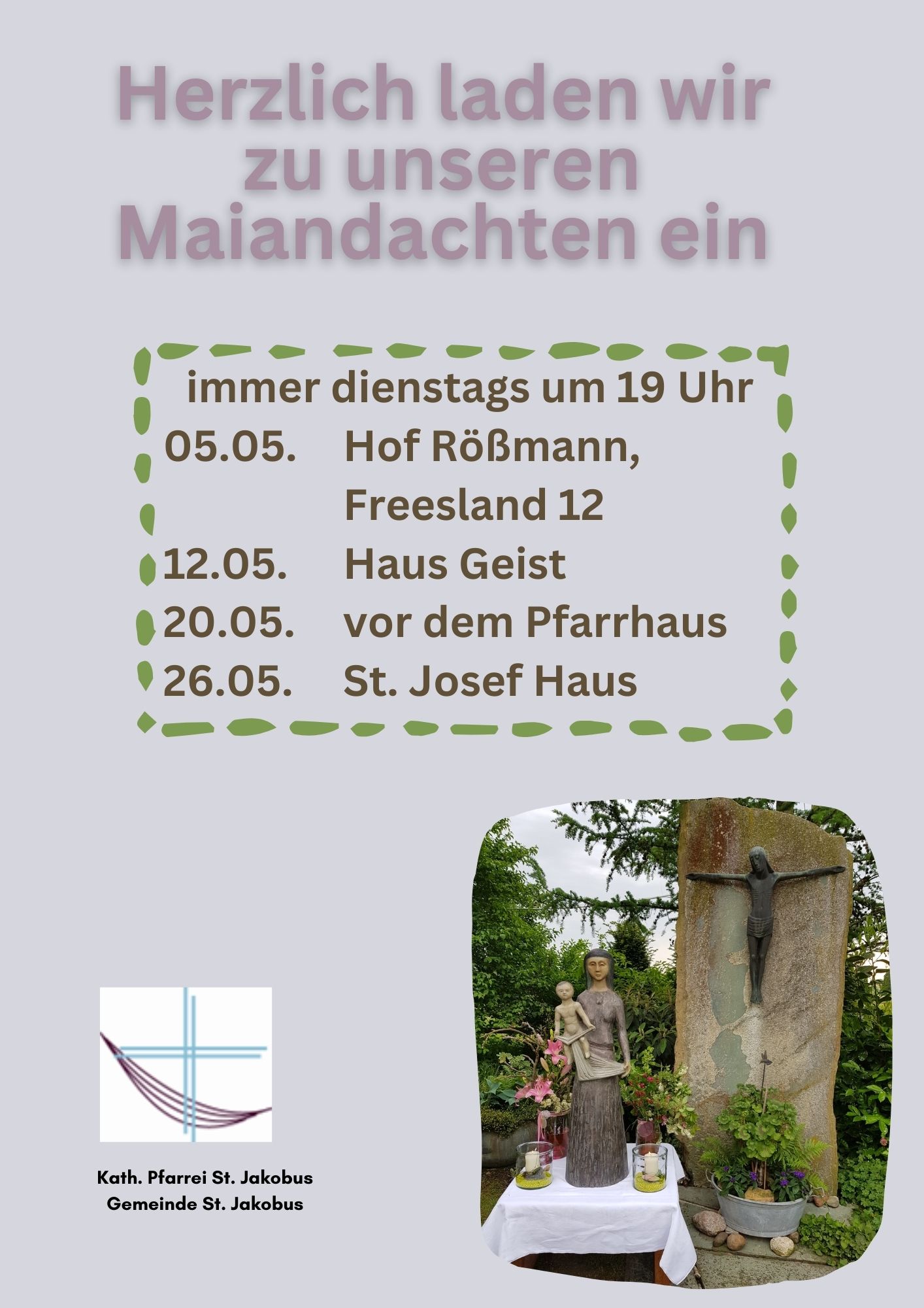 Einladung zu den Maiandachten Herzlich laden wir alle Gemeindemitglieder und Interessierten zu unseren diesjährigen Maiandachten ein. Gemeinsam möchten wir im Marienmonat Mai innehalten, beten und die besondere Atmosphäre dieser Andachten erleben. Die Maiandachten finden jeweils dienstags um 19 Uhr an wechselnden Orten statt: 05. Mai: Hof Rößmann, Freesland 12 12. Mai: Haus Geist 20. Mai: …