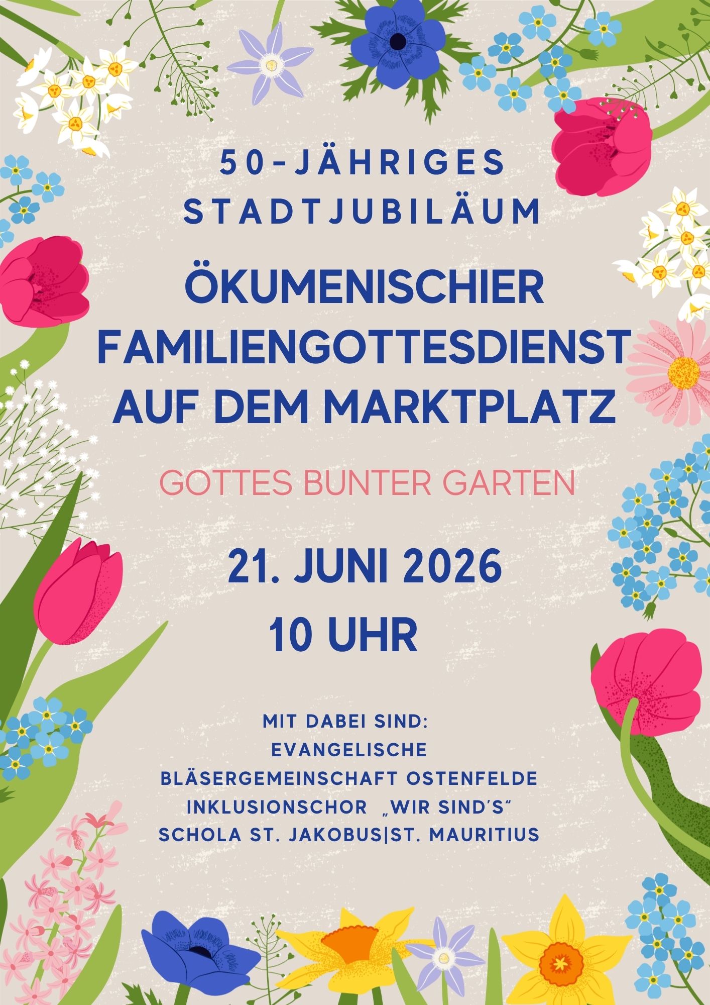 Zum 50-jährigen Stadtjubiläum laden wir herzlich zu einem besonderen ökumenischen Familiengottesdienst ein! Am 21. Juni 2026 um 10 Uhr verwandelt sich der Marktplatz in einen Ort der Begegnung, der Freude und des gemeinsamen Feierns. Unter dem Thema „Gottes bunter Garten“ erwartet Sie ein lebendiger Gottesdienst für Groß und Klein, der die Vielfalt und Gemeinschaft unserer …