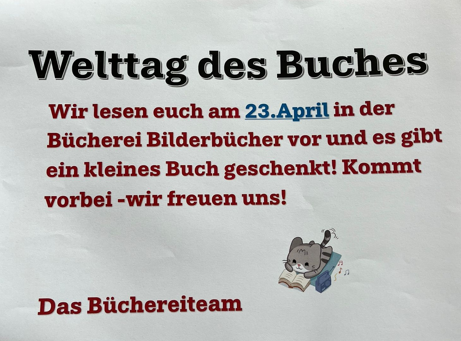 Welttag des Buches 📚 Am 23. April laden wir euch herzlich in unsere Bücherei ein!Gemeinsam lesen wir Bilderbücher und entdecken spannende Geschichten. Als kleines Highlight wartet sogar ein Geschenk-Buch auf euch! 🎁 Kommt vorbei – wir freuen uns auf euch! Euer Büchereiteam