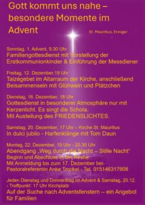 Am Donnerstag, 04.12. um 16 Uhr laden wir alle jüngeren Kinder mit ihren Eltern und Großeltern zur Kinderkirche im Advent in die St. Jakobus Kirche ein. An diesem Nachmittag entdecken wir die Reise von Maria und Josef nach Bethlehem. Das Vorbereitungsteam freut sich auf viele große und kleine Besucher.