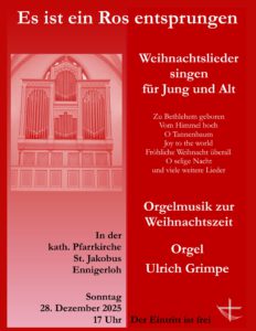 Am Sonntag, den 28. Dezember 2025, um 17 Uhr lädt Organist Ulrich Grimpe zu einem besonderen Weihnachtsliedersingen und weihnachtlicher Orgelmusik herzlich ein.