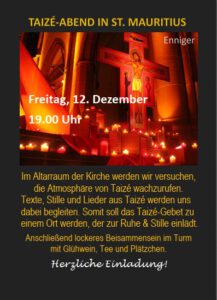 Sind Sie allein oder Ihre Familie zu klein? Möchten Sie Heiligabend in größerer Gemeinschaft verbringen? Wir bieten den Rahmen, diesen besonderen Abend gemeinschaftlich zu gestalten und zu feiern. Zur Einstimmung beginnen wir den Abend mit der feierlichen Christmette in der St. Mauritius Kirche in Enniger. Anmeldungen: bis zum 2. Advent bei Heike Fissahn, Anne Schroeter oder im Gemeindebüro St. Mauritius 02528-950190.