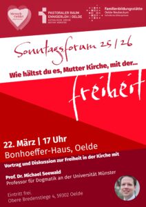 Der Pastorale Raum Ennigerloh | Oelde und die Familienbildungsstätte Oelde-Neubeckum laden im Rahmen des Sonntagsforums zu einem Vortrag ein. Unter dem Titel „Wie hältst du es, Mutter Kirche, mit der Freiheit?“ spricht Prof. Dr. Michael Seewald, Professor für Dogmatik an der Universität Münster, über das Thema Freiheit in der Kirche.