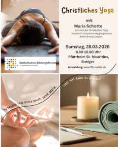 Christliches Yoga am Samstag, 28.03.2026 von 9.30 Uhr bis 16 Uhr im Pfarrheim St. Mauritius Enniger. Wie hängen geistliches Leben und körperliche Existenz zusammen? Im Schnupper-Workshop möchten wir diesem Zusammenhang nachspüren. Dabei helfen und die Bewegungselemente aus dem Hatha-Yoga, ein Wort aus der Bibel, das Gebet und Übungen aus der Achtsamkeits- und Entspannungspraxis. So bietet der Tag einen Erfahrungsweg für Leib und Seele.
