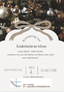 Am Donnerstag, 04.12. um 16 Uhr laden wir alle jüngeren Kinder mit ihren  Eltern und Großeltern zur Kinderkirche im Advent in die St. Jakobus Kirche ein. An diesem Nachmittag entdecken wir die Reise von Maria und Josef nach Bethlehem. Das Vorbereitungsteam freut sich auf viele große und kleine Besucher.