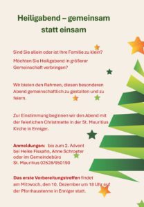 Sind Sie allein oder Ihre Familie zu klein? Möchten Sie Heiligabend in größerer Gemeinschaft verbringen? Wir bieten den Rahmen, diesen besonderen Abend gemeinschaftlich zu gestalten und zu feiern. Zur Einstimmung beginnen wir den Abend mit der feierlichen Christmette in der St. Mauritius Kirche in Enniger. Anmeldungen: bis zum 2. Advent bei Heike Fissahn, Anne Schroeter oder im Gemeindebüro St. Mauritius 02528-950190.
